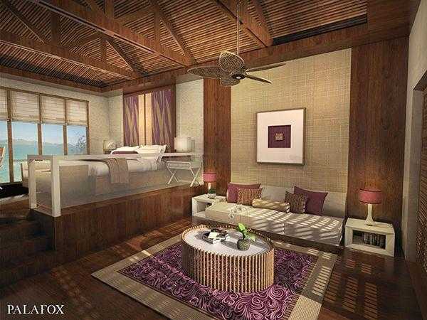 An atmosphere of subtle elegance was created with intricate wooden furniture pieces complementing the overall minimalist style of each suite. Attention to detail and symmetry was given to the layout of each villa. Colors range from white to the delicate shades of beige to create a romantic atmosphere that doesn’t draw the guest’s attention away from the island’s tropical spectacular views and lush environment. In order to blend in with each structure’s site, each villa is given a distinct color palette.