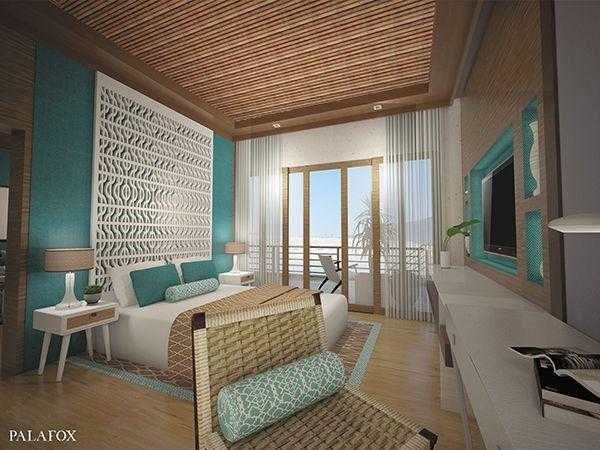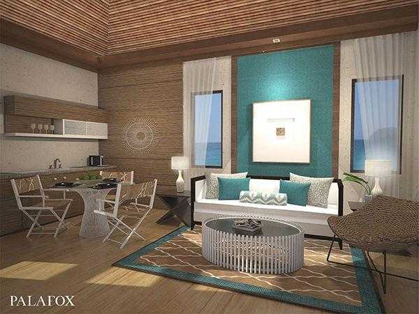An atmosphere of subtle elegance was created with intricate wooden furniture pieces complementing the overall minimalist style of each suite. Attention to detail and symmetry was given to the layout of each villa. Colors range from white to the delicate shades of beige to create a romantic atmosphere that doesn’t draw the guest’s attention away from the island’s tropical spectacular views and lush environment. In order to blend in with each structure’s site, each villa is given a distinct color palette.