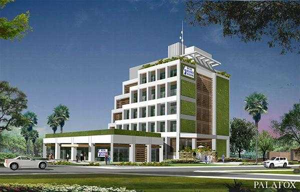The five-storey office building has higher ceiling heights that allow natural ventilation and passive cooling, and are glided with low maintenance greenery. The perimeter facade follows a utilitarian look, which extends into the building interiors.