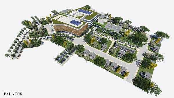 The largest buildings on the site are the Hospital, Medical Arts Center, and multi-storey parking facility, all interconnected. They will be equipped with the latest technologies and modern facility design for the 21st century patient. The double-glazed facade is covered with composite timber cladding, set vertically at irregular intervals. A retirement village is planned for Tarlac’s senior citizens for their rehabilitation, and wellness activities.